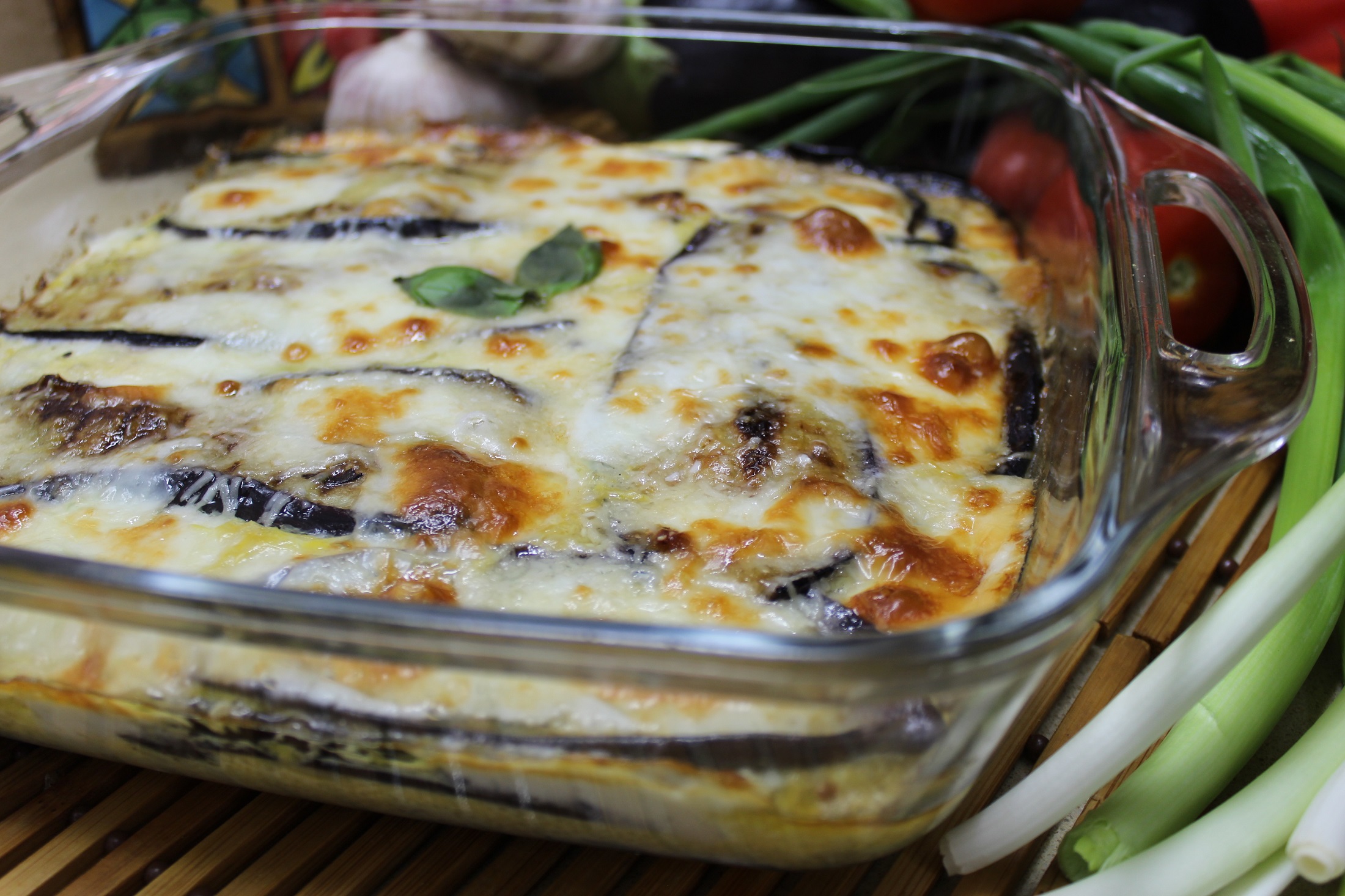 Далее остается слоями выложить все в жаропрочную форму соблюдая порядок от баклажан до сыров и яичной заливки, плюс немного порванного прямо руками базилика.