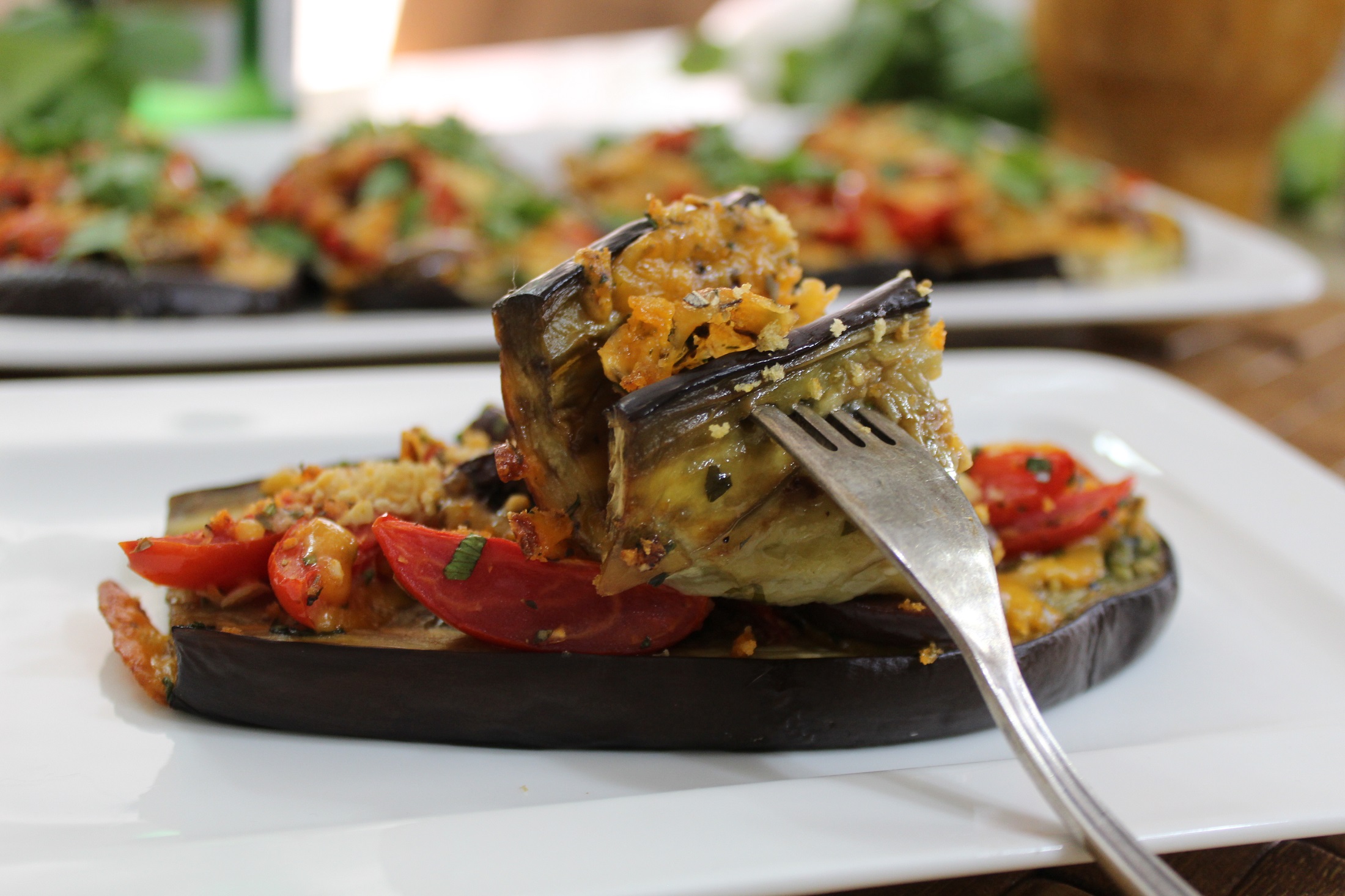 Подпеченные баклажаны через минут 20 достаем из духовки и на каждый выкладываем начинку из помидор и сыра. Сверху для более хрустящей корочки, присыпаем панировочными сухариками и возвращаем в духовку на те же 200 градусов еще минут на 10-15.