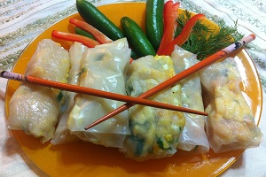 Берем: готовые листы рисовой бумаги, 4 варенных яйца, креветки, зеленый лук, соль (можно соевый соус), зубчик чеснока и растительное масло для жарки.