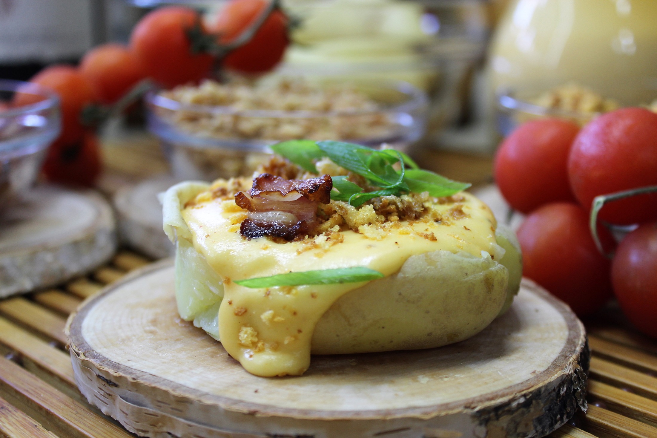 Добавляем сверху соус и присыпаем... можно жареным беконом, можно жаренными панировочными сухариками, можно луковыми чипсами, можно жареными грибами... и немного зелени сверху. Типа вишенка на торте!. Смотрится очень аппетитно, поверьте. Про вкус сказать нечего. Картофель вообще испортить трудно, а уж богатым сырным соусом - вообще невозможно. Ну очень рекомендую. И приятного Вам аппетита!