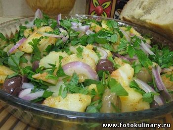 Честно сказать картофельные салаты хороши с любыми добавками... ну не потопляемы они... и все тут! Вопрос только в том, что сегодня есть в наличии в холодильнике, какой овощ Вы предпочитаете в это время суток или как смело и далеко сегодня шагнула Ваша фантазия. Сегодня хочу поделится рецептом крайне простым, нежно любимым... Если Вы отварной картофель пока решались использовать только в винегретах и всякого вида "оливье" смело присоединяйтесь, готовьте и угощайте и гостей и домашних вот такими простыми, вкусными, быстрыми салатами как, например, этот. Честно сказать, лично я готова есть этот салат и на завтрак и на обед и на ужин... а если быть совсем честной... я бы и ночью вставала полакомиться!... приблизительно на пол. килограмма картофеля (конечно лучше бы молодого) берем одну среднюю красную луковицу, пучок петрушки и горсть оливок. Для заправки цедра и сок половинки лимона, соль, перец черный и паприка и оливковое масло.