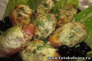 И выкладываем на смазанный растительным маслом противень. Сверху каждую картофелину поливаем разболтанным желтком. Выпекаем в разогретой до 200 градусов духовке 30-40 минут.