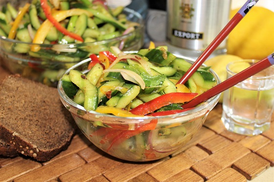 Нарезаем чуть наискосок на не слишком тонкие ломтики, приблизительно сантиметровой толщиной. Выкладываем в салатник.
