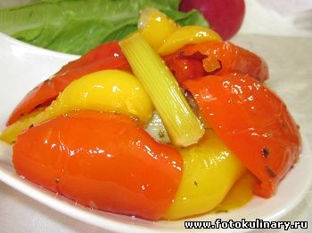 Болгарский перец - это овощ, который помимо того, что очень вкусен, он содержит очень много витаминов. Способов приготовления, а точнее использования болгарского перца, очень много. Его добавляют в супы, тушат с овощами и мясом, фаршируют, используют в салатах, в заготовках и для приготовления лечо и соусов. Болгарский перец вкусен как в маринованном, так и в жаренном, печенном, тушенном и свежем виде. И к тому же он совершенно бесстыдно хорош собой! Ну ничем его не испортишь... так что можно смело экспериментировать! Тем более, что, на мой вкус, чуть сладковатый маринад для перца - это идеальный выбор. Берем: 4 перца (безусловно, разноцветные сильно украсят ситуацию, впрочем, без зеленого перца можно обойтись запросто... ну травянист он на вкус... и никуда от этого не деться), 2 стебелька лука порея (соответственно , только белая, бледно-зеленоватая, самая нежная его часть), оливковое масло, сок половины или целого лимона, сахар 1-2 чайные ложки, соль, черный молотый перец и орегано (по желанию).