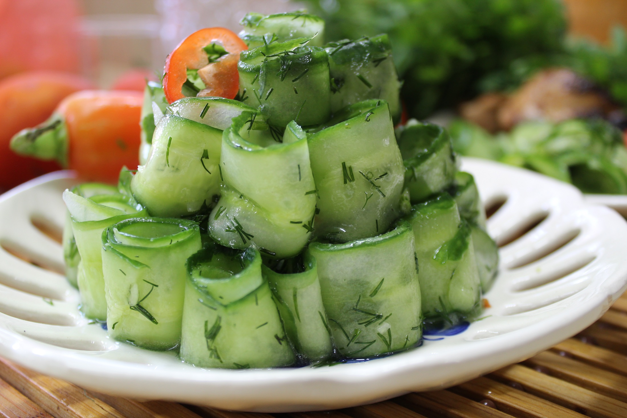 Огурцы старательно намываем, вытираем и в контейнер с крышкой трем (нарезаем) на тонкие слайсы при помощи овощечистки.