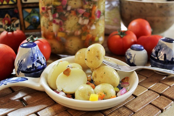 Отваренный картофель (если крупный) нарезаем на шайбочки, при желании предварительно освободив от кожуры, мелкий при помощи зубочистки глубоко и часто накалываем и складываем в банку, предварительно убедившись, что для нее (для банки) в хозяйстве таки есть подходящая крышка.