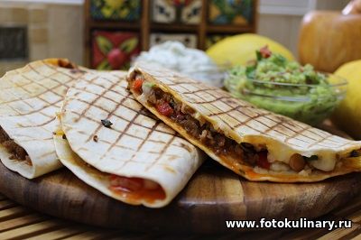При подаче каждую кесадилью можно порезать пополам. Сыр скрепляет начинку и она не вываливается даже если есть необходимость или желание порезать более мелко. Подготовленной начинки хватит на 10-12 лепешек. Но жарить их все сразу нет никакой необходимости. Начинка может подождать второго выхода на бис и в холодильнике. А кесадилью лучше подавать горяченькой, пока сыр тянется и мясо "дымится", макая в соус. Хотите "погорячее" в гуакомоле... , или в сметанный.