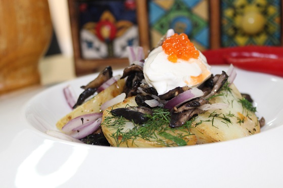 За счет того, что в приготовлении животные жиры не использовались, салат этот одинаково хорош и в холодном и в горячем виде. Картофель типа "Пушкин" и жаренные грибы (кстати, при желании можно заменить и на маринованные и на соленые) это парочка просто созданная друг для друга. Сметана в заправке - это вообще фишка всех северных (и не только) народов, которая объединяет не только влюбленных друг в друга картофель с грибами, но и пафосную икру, придающую этом салату и свою фишку, и свой шарм. Попробуйте! Таким салатом можно заменить целый ужин. Вкусно, просто, сытно! И приятного Вам аппетита!