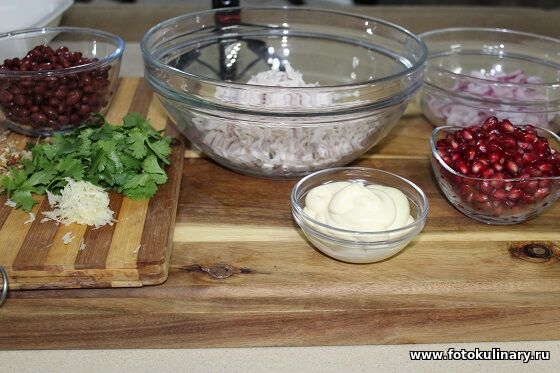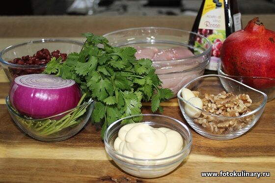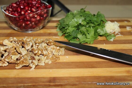 От граната, естественно, нужны только зернышки... чистим. От кинзы - только нежные листики. Освобождаем (от веточек). Чеснок либо трем на мелкой терке, либо через чеснокодавилку, он здесь только для аромата. Грецкий орех подсушиваем либо в духовке, либо на сухой сковороде и нарезаем. Не мельчим.