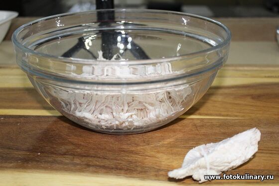 Грудка нужна отварная. Очень вкусно будет приготовить и из копченной. Чтобы отварная (поскольку это гораздо практичнее и доступнее) была бы сочной и вкусной, варим ее закладывая в уже кипящий и чуть подсоленный овощной бульон. Варим на большом огне и сильном кипении 15 минут. Выключаем. Даем остыть прямо в бульоне. Потом двумя вилками или руками разбираем на волокна.