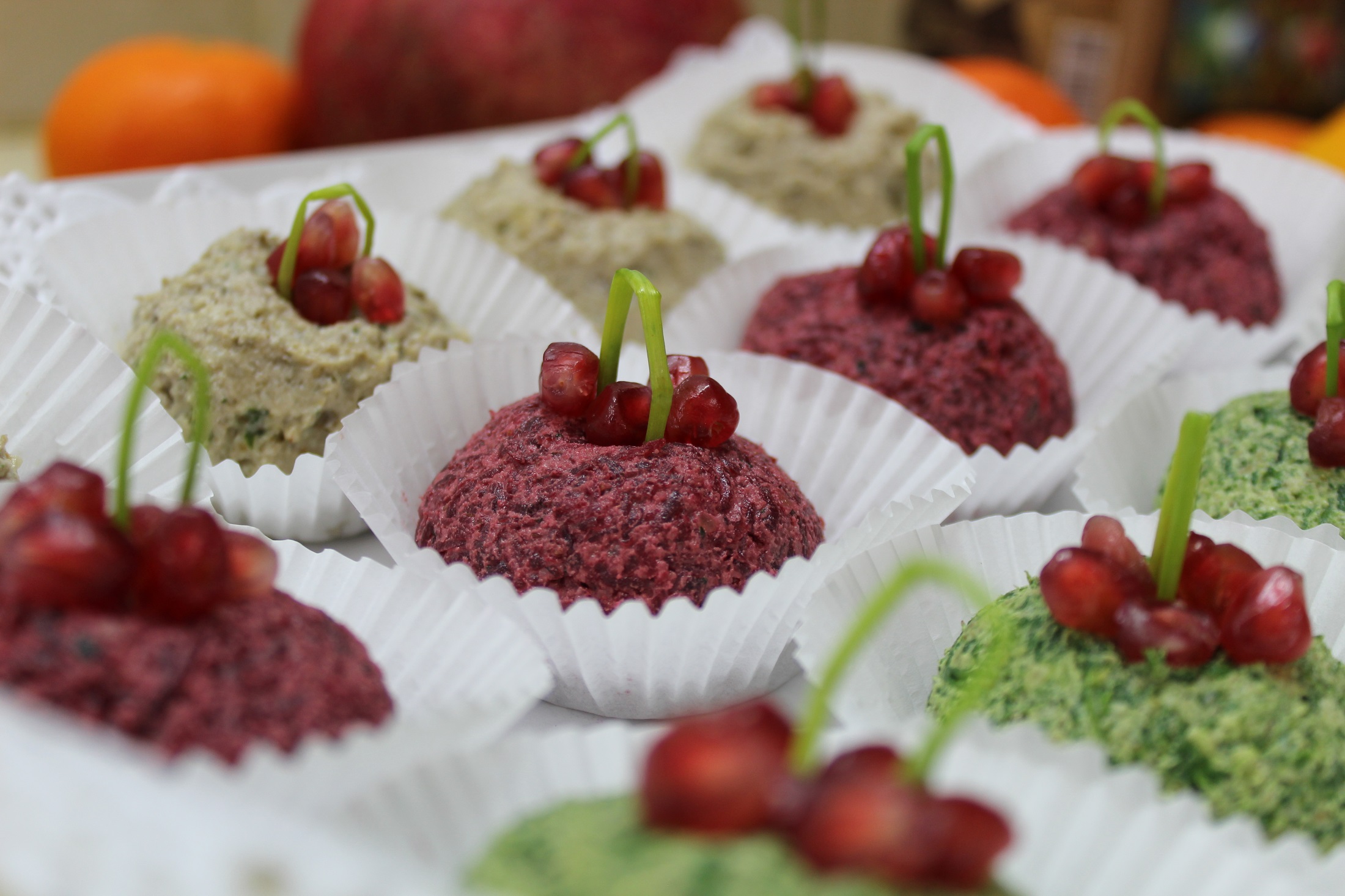 Руками смазанными растительным маслом или смоченными водой формуем шарики с грецкий орех величиной, в центре делаем небольшое углубление и наполняем его зернами граната.