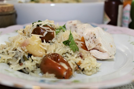 Начинаем с того, что сразу включаем разогреваться духовку на 160 градусов и займемся приготовлением овощей, которые придадут рису особый вкус, аромат и, простите, нарядность. В жаропрочную форму выкладываем томаты, целые чищенные зубчики чеснока, резанный не слишком мелко лук, кинзу (оставив немного для подачи), тимьян, половину нормы соли, перец и оливковое масло. Все аккуратно перемешиваем и отправляем в разогретую духовку на час.