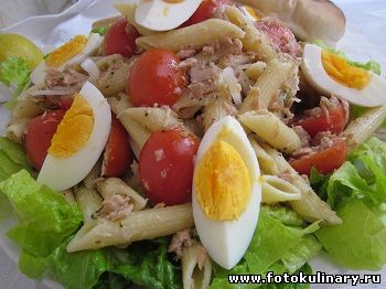 В наших краях консервированный тунец, или как его принято тут называть туна - продукт крайне распространенный. Почти как в свое время в советских магазинах была "популярна" консервированная кабачковая икра. Вот всего могло не оказаться в магазине, ну буквально, как это говориться, чего только не захочешь, того может и не быть.... а вот стеклянные банки с кабачковой икрой были всегда. А вот тут консервированная туна тоже есть... ВСЕГДА! И спасибо! Лично я люблю (впрочем, как и кабачковую икру). И семья моя тоже. Да и Вы, надеюсь, присоединитесь. Да и вариантов салатов из нее не мало, а значит и на свой вкус всегда можно подобрать. Быть может это тот самый, Ваш, случай. Берем: 2 банки консервированного тунца в собственном соку, половинку репчатого лука, несколько литьев салата, 3-4 отварных яйца, штук 10-12 помидоров черри и грамм отварных макаронов (естественно твердых сортов) типа пенне.