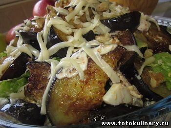 Салаты и закуски из баклажан - это, конечно, весьма выгодное время и силы вложение. Вот готовишь, казалось бы, просто салат, а в результате получаешь целый ужин. Все сыты, все довольны, всем вкусно и никакой тяжести. Подавать такой салат можно и совсем не так, как я сегодня соорудила на скорую, рабочекрестьянскую руку. Очень эффектно можно подать слоями... и что это я сегодня... да, честно сказать, специально. Очень мне по душе некая домашняя добротность и брутальность что-ли. Ну вкуснее мне от этого... Все крупно, сытно, вкусно! Для салата берем (все пропорции весьма относительны, приблизительны и к соблюдению не обязательны) 3 средних баклажана, листья салата типа "айсберг" или "романо", грамм 50 твердого сыра, 2-3 зубчика чеснока, 2-4 отварных яйца, горсточку подсушенных на сухой сковороде грецких орешек, штук 8-10 помидорок "шерри", майонез (лучше домашний) для заправки, соль, черный молотый перец, паприка и растительное масло для обжарки.