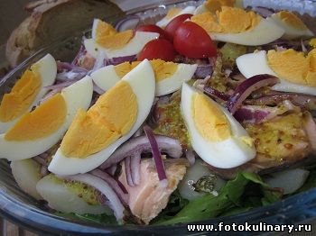 Простой, добротный, вкусный и весьма нарядный салат получается. А если еще взять во внимание, что зачастую, такой салатик готовиться в целях так сказать утилизации, не хватающей на всех полноценной порции рыбы, то ценность и необходимость знать подобные рецепты даже не обсуждаются. Принимаются как факт и используются (с большим, надо сказать, удовольствием) и по будням и по праздникам, и для семейного ужина и для праздничных столов для друзей и товарищей. Тем более, что рыбные салаты с зеленью и без тяжелых майонезных заправок, просто не могут не привлечь особое внимание людей следящих (или хотя бы делающих такой вид) за хотя бы видимость сохранения фигуры и за здоровьем. Итак! Берем: пару кусочков красной рыбы, либо отварной, либо жаренной, либо как у меня приготовленной на гриле, на костре., 2 отварных яйца, 5-6 штучек отварной, желательно молодой, мелкой картошки, одна красная луковица и листья зеленого салата, желательно бэби-микс.