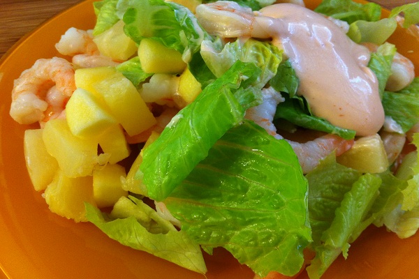 И добавляем все наши ингредиенты (креветки, яблоки и ананасы).