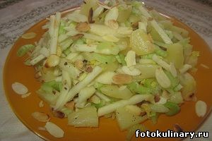 Популярность, которую последнее время приобрел сельдерей, переоценить очень трудно! Похоже, что стадное чувство настолько глубоко сидит у меня в подсознании, что руки так и чешутся написать хвалебную оду этому потрясающему овощу... Берем себя в руки... и молча делаем, что умеем... салатик... из сельдерея, естественно! Надо: черешки сельдерея - пучок, баночка консервированного ананаса, два яблока, лимон для заправки и миндальная стружка.