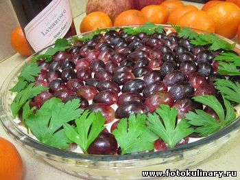 На самом деле, я не самый ярый поклонник слоеных салатов. Ну как то не смогла я по достоинству оценить их. На своем веку буквально 3-4 слоеных салата показались мне сбалансированными и продуманными по вкусу. Чаще попадались салаты где бодро наслаивалось все подряд... Красиво! Но!... Вот этот салат явно не из этого печального ряда. Ну и какие еще могут быть вопросы, если в салате сочетаются виноград и сыр... Это уже вне конкуренции! А если еще и орешки... миндальные, естественно! С удовольствием вынуждена констатировать - мой список удачных слоеных салатов растет! Я этому очень рада и приглашаю Вас порадоваться вместе! Как и всегда в салатах, точные пропорции указывать даже не буду придуриваться, Все берем в тех соотношениях, которые лично вам на сегодня особенно приятны. Орешек можно и побольше, майонеза, соответственно, поменьше, на грудку с одной курочки надо около 5 яичек, сыр, миндаль, виноград (лучше крупный и без косточек), зелень для украшения и майонез.