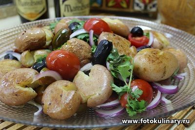 Такой драматически эффектный картофель обжариваем с обеих сторон до легкой золотистости на сковороде с оливковым маслом. Добавляем оливки и черри, перемешиваем, давая им прогреться. Выключаем нагрев, добавляем сверху лук, НЕ перемешиваем, сверху присаливаем крупной солью, присыпаем крупно молотым черным перцем и красным жгучим. Збрызгиваем сверху оливковым маслом. Присыпаем кинзой и прямо к столу.