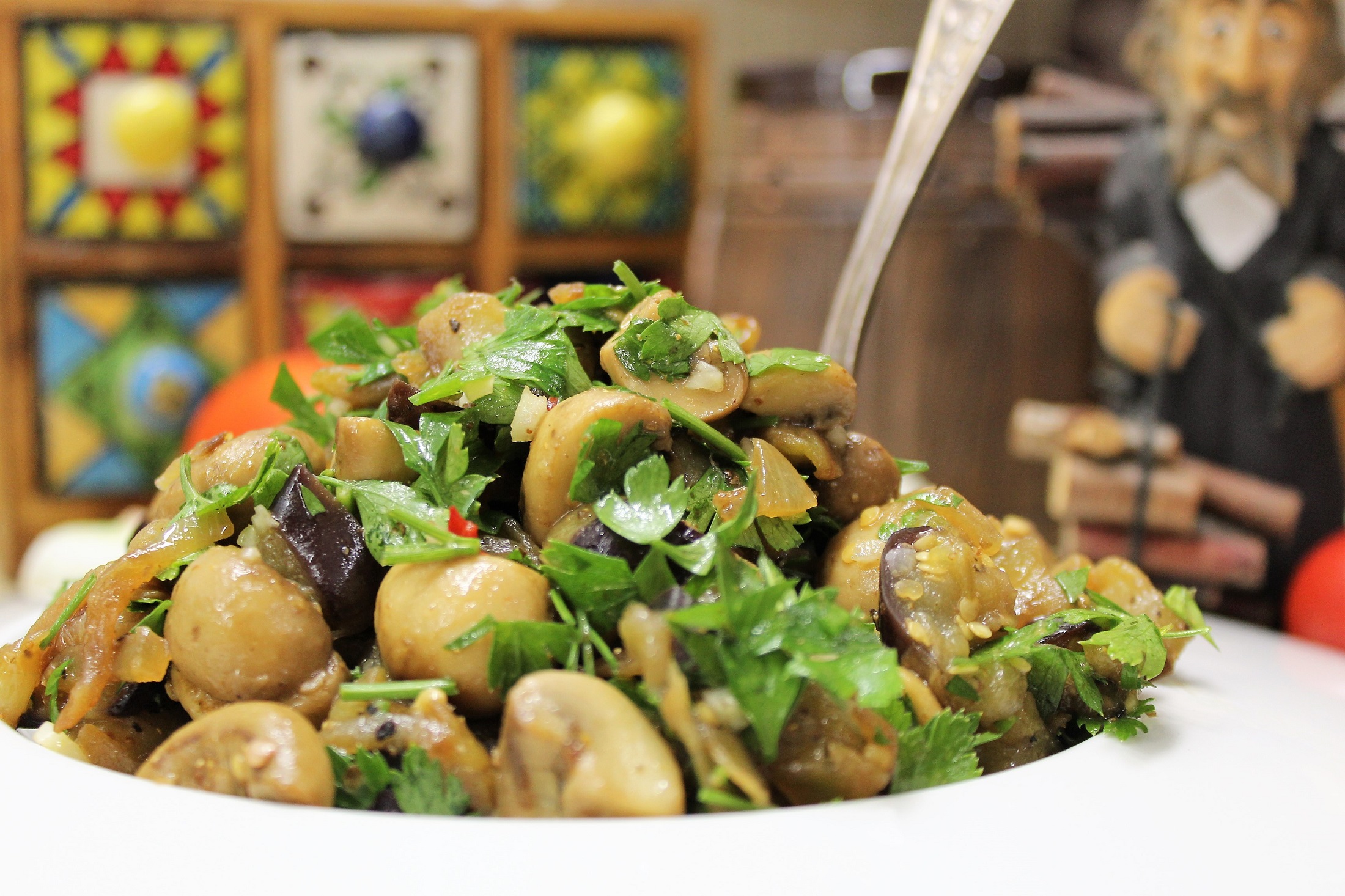 Теперь с салатнице собираем нашу закуску. Баклажаны, грибы с луком, зелень, чеснок, перец, кориандр, сахар, уксус... все сюда. Перемешиваем. Снимаем пробу...