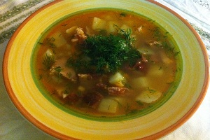 Подавать с зеленью обязательно, с сухариками предпочтительно и с чесночком... на любителя. Приятного Вам аппетита!