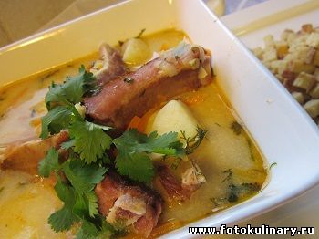 Гороховый супчик - это один из фаворитов советского времени. Готовили его тогда, конечно же преимущественно без копченостей, достать которые было уж совсем не реально да и без других изяществ. Несмотря на это, суп был и есть из самых любимых и популярных в народе. И не только благодаря своей бюджетности и простоте приготовления, но и главным образом, благодаря своим исключительным вкусовым качествам. Особенно часто этот супчик готовили, конечно же, зимой. В холодное время. Ароматный, согревающий, очень вкусный. Ну почему бы опять не побаловать себя! Тем более, что и со временем года мы в тренде. На 3 литровую кастрюльку берем: 1 стакан сушеного гороха, 1 среднюю луковицу, 2-3 средние картошки, 2 средние морковки, корень сельдерея и петрушки, 2 столовые ложки мягкого плавленного сыра или крем-сыра, 1 столову. ложку кетчупа (можно заменить томатной пастой, но в кетчупе уже специи есть и это лично меня страшно радует и привлекает), соль, черный перец горошком, лавровый лист, грамм 500-700 копченых ребрышек, растительное масло для обжарки, 4-4 зубчиков чеснока и немного зелени. Для подачи сухарики из белого хлеба (чесночные - это вообще идеально).