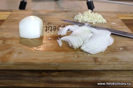 Чеснок мелко рубим. Лук нарезаем тонкими лепестками. Кинзу освобождаем от твердых лепестков. оставляя только нежные листики.