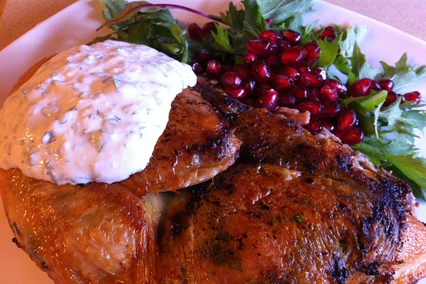 Натираем курицу смесью зелени и чеснока, но не сверху (при жарке зелень и чеснок сильно обгорают и неприятно пахнут), а под шкуркой. Она, (в смысле шкурка) кстати, держится на курице буквально "на соплях" (не к столу будет сказано). И сделать это крайне просто. Сверху курочку солим, перчим с обеих сторон и убираем в таком виде на пару часов мариноваться в холодильник.