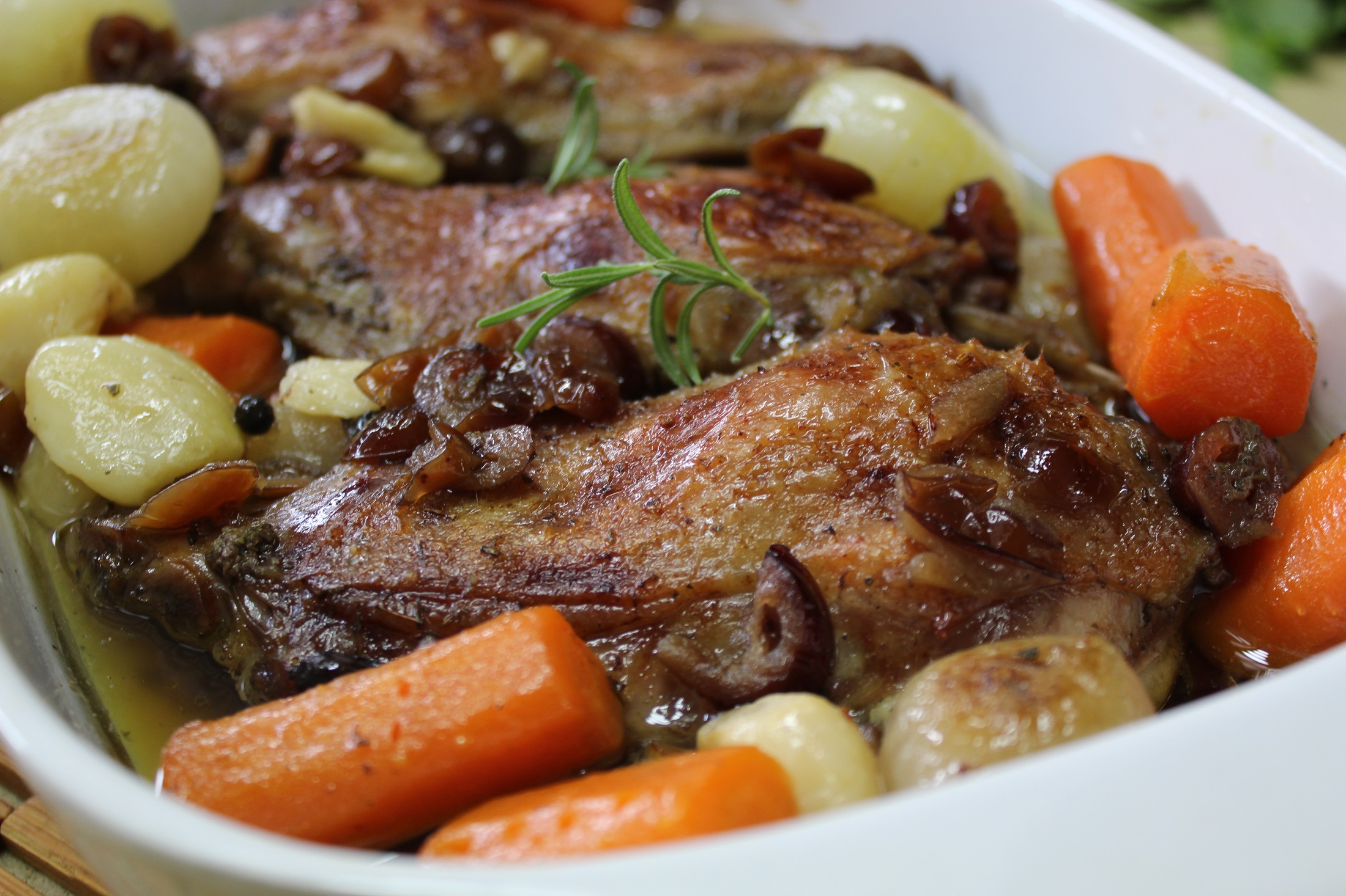 чтобы овощи успели приготовиться и обменяться вкусами и ароматами с соусом, а гусь успел загореть до аппетитной золотисто-коричневой, хрустящей корочки. Подавать можно прямо в том же блюде, присыпав свежими веточками тех же розмарина и тимьяна. Между прочим, блюдо к любому праздничному застолью придется ко двору... а уж к Рождественскому или
