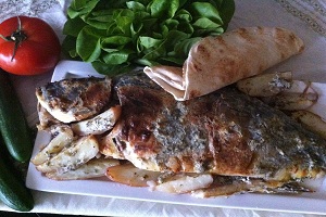 На лук кладем карпа, хорошо смазанного снаружи и внутри морской солью и перцем.