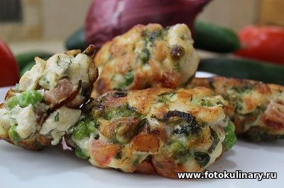 Для "начинки" горсточку размороженного зеленого горошка и 1-2 небольших помидора (можно заменить на обжаренные грибы и сыр, на кукурузу и морковь или на ошпаренную цветную капусту и брокколи, например...)