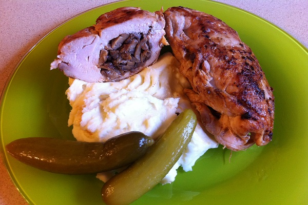 Куриные грудки режем пополам, делаем в каждой половинке продольный надрез, стараемся не прорезать грудку насквозь. В полученный кармашек щедро кладем начинку (в нашем случае грибы).