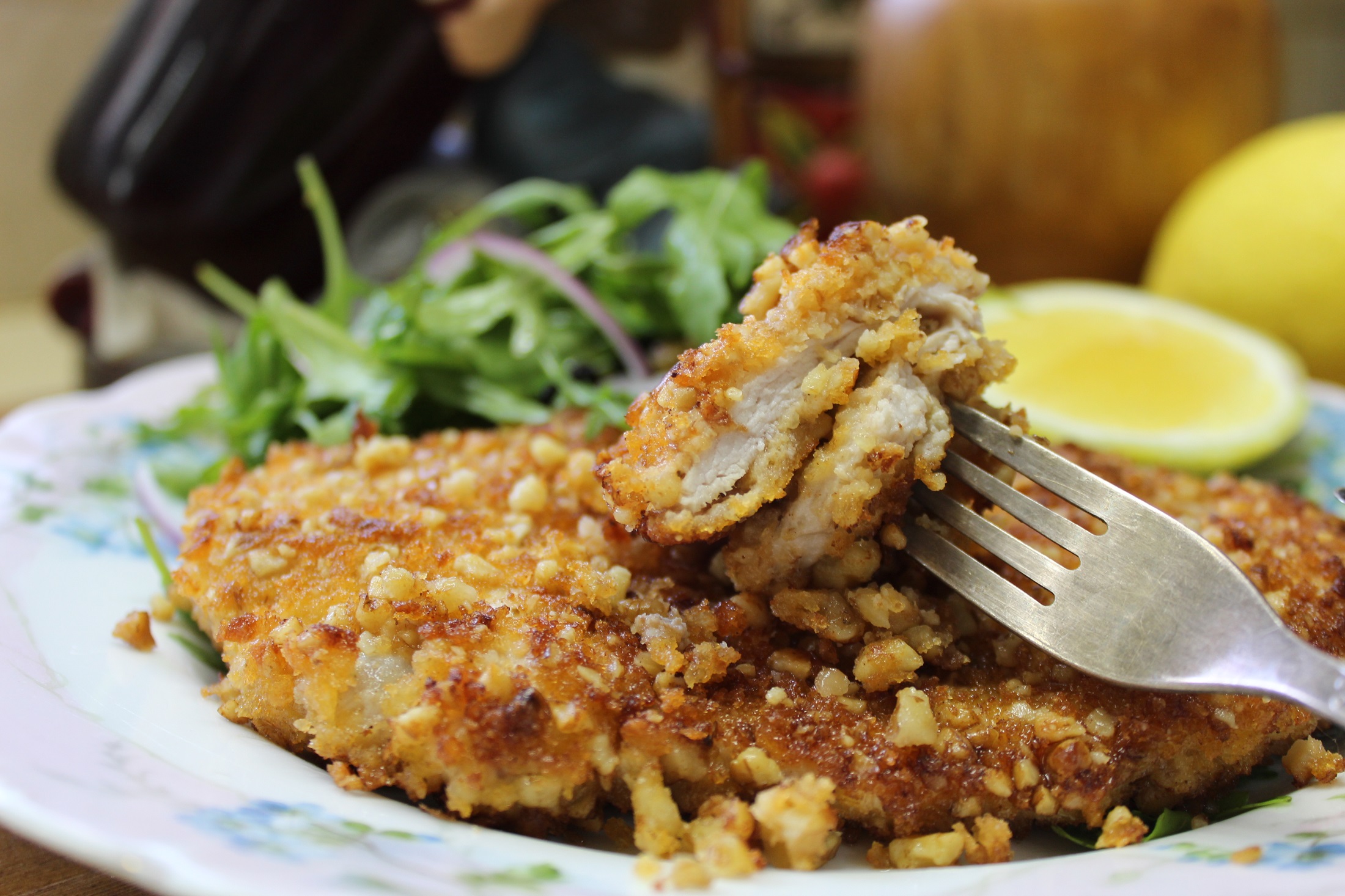 промаринованные кусочки панируем в смеси сухарей и орешек. Чуть придавливаем, чтобы и панировка лучше держалась, да и восполняем пропущенный ранее нами момент отбивания шницелей.