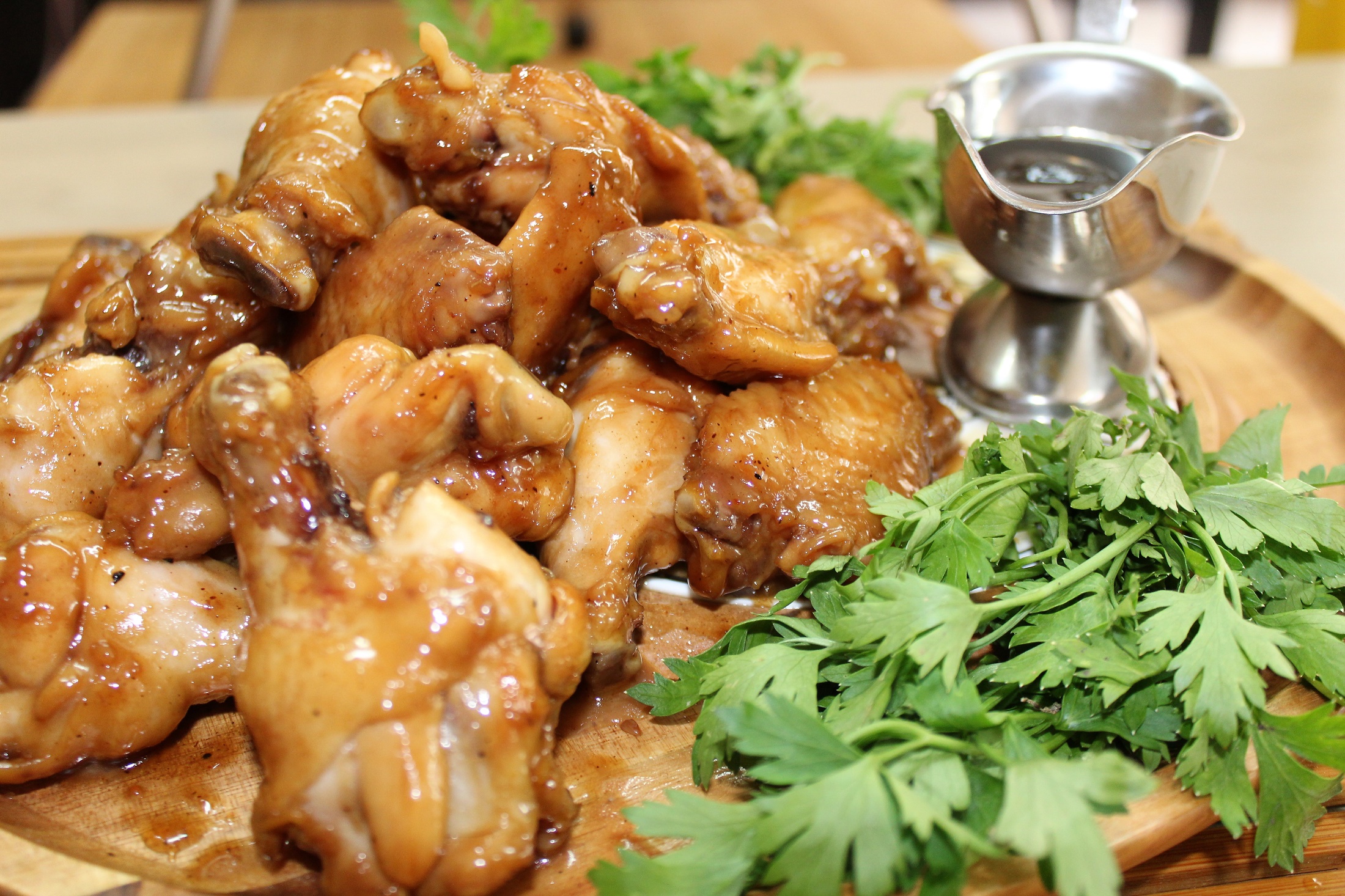 это будут крылышки-ириски и густой карамельно-острый соус. Готово! Выкладываем на блюдо... хотите контрольный выстрел, посыпьте подсушенным кунжутом. Соус можно и сверху налить и отдельно в соуснике подать... еще немного зелени... бокал охлажденного пива... и футбольный матч "Германия - Бразилия" , например. Вот и скажите после этого, что килограмм крылышек это много! Надо делать две порции. Точно! Тем более, что на запах... возможны гости. Ждем! И приятного им и нам аппетита!
