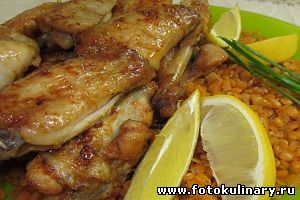 Промаринованные крылышки выкладываем на смазанный растительным маслом противень и выпекаем в разогретой до 200 градусов духовке минут 40.