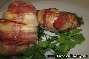 Сворачиваем рулетиком и оборачиваем беконом сначала закрывая боковые швы