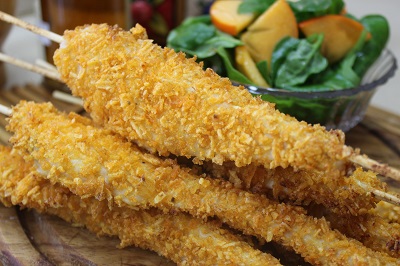 Получается действительно очень симпатичные золотистые домашние шашлычки, с золотистой хрустящей яркой на вкус корочкой, нежные ароматные, сочные и полезные внутри. Попробуйте! Приятного Вам аппетита!