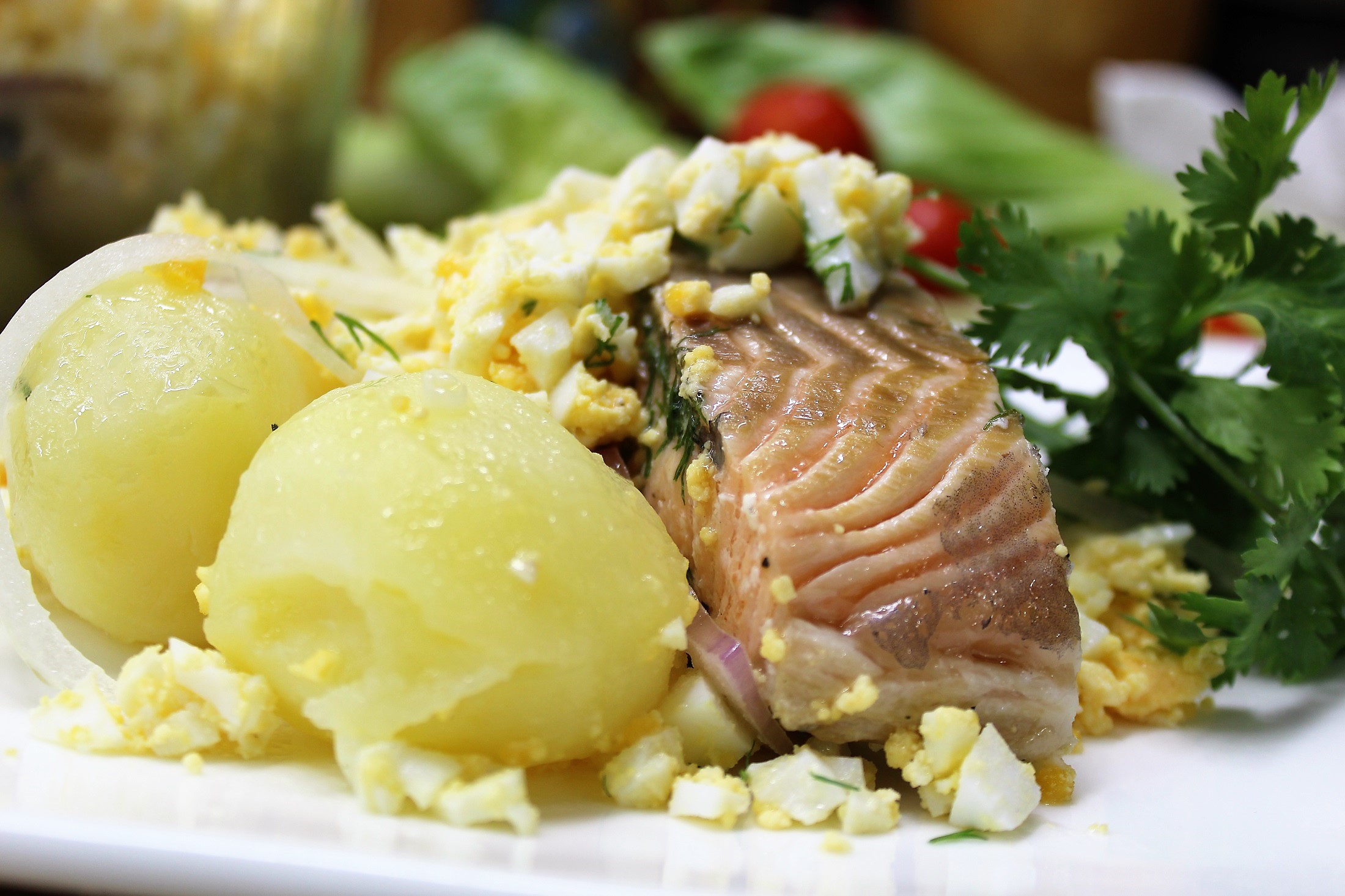 Картофель чистим (приблизительно 2-3 маленькие картофелины на один кусочек рыбы) и ставим вариться. Солим картофель после закипания и варим до готовности (мягкости).