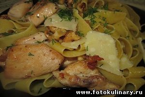 При подаче, конечно же, посыпаем сыром. Можно немного присыпать зеленью (базиликом - предпочтительно, но что-нибудь другое - не катастрофа! Факт!) Орешки и чуть медовый привкус - это фантастическое дополнение к курице и паппарделе! Ну очень, ОЧЕНЬ! Приятного Вам аппетита!