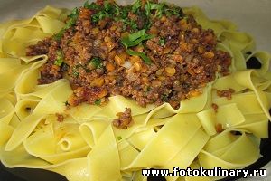 Конечно, подобное блюдо подкупает простотой приготовления. Для него не надо никаких специальных кулинарных навыков. Любая, уставшая после рабочего дня, домохозяйка (или домохозяин) без особого труда и без мучительно долгого выстаивания у плиты, сможет приготовить такой вкусный и быстрый ужин. Берем: пачку макарон, лучше ленточных, моих нежно любимых паппарделле, например, 2-3 помидора, луковица, зелень (базилик предпочтителен), чечевица пол стакана, фарш грамм 300-400, томатная паста - 1 ст. ложка, соль, перец, орегано и оливковое масло.