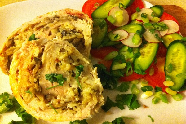 Куриное мясо, наверное, самое полезное и диетическое. И почему бы не порадовать своих родных вкусным и нежным куриным рулетиком. Берем: куриные грудки - 4 шт., шампиньоны - 2 банки (150 грамм), отваренный рис - 5 ст. ложек, лук - 1 большой, сливки, соль, перец.