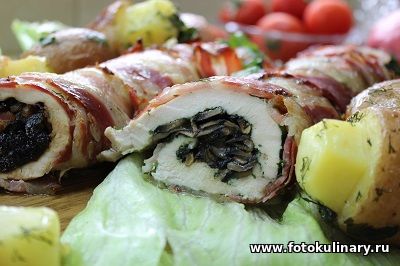 Минут через десять к куриному рулету можно добавить отварной до полу готовности картофель. Перед этим чуть взбрызгиваем его (картофель) оливковым маслом и присыпаем зеленью обкладываем им рулеты. Вместе они будут допекаться еще минут 20.