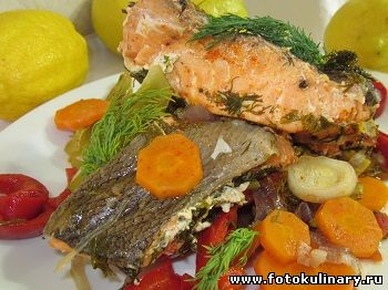 Блюда из ароматной, легкой и необыкновенно вкусной красной рыбы (форели, семги или лосося) очень долгое время считались доступными только для "избранных". Сегодня же этими "избранными" стали все мы (аллилуйя!). С супермаркете теперь можно купить и охлажденную и замороженную и свежую и малосольную и копченную и разделанную на стейки и целую... Знай только выбирай, плати (порой кстати и не мало) и готовь. А уж сколько изысканных, полезных, вкусных и оригинальных блюд можно из нее приготовить... На все случаи жизни... и на праздничное застолье, и легкий на ужин, и на закуску, и к обеду... и главное это не только изыскано вкусно, еще и полезно и диетически (а это в преддверии неизбежно наступающего лета, становится как то особенно актуально). И совершенно нет необходимости готовить красную рыбу по сложным рецептам! Не тот случай. Здесь главное не приукрасить, а не испортить! Так что смело предлагаю прекрасный вариант кулинарного "хеден шолдерса" (типа два в одном)... рыба и прекрасный гарнир в одной кастрюльке. Удивительно просто и изыскано вкусно... как, впрочем, и обычно в блюдах с красной рыбой. Берем: семга половинка рыбки весом приблизительно килограмм-полтора, один ну очень крупненький помидор, 3 средние морковки, 2-3 небольшие (или одна крупная) луковица-репка, 1-2 болгарских сладких перцев, 3-4 черешка сельдерея, зелень, немного оливкового масла, соль (лучше, как впрочем и всегда для рыбы, крупная морская), перец черный свеже молотый и паприка.