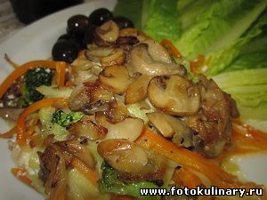 Добавляем к луку грибы и обжариваем вместе до выпаривания из грибов лишней жидкости и приобретения ими (грибами) приятного аппетитного окраса. (минут 10 это занимает)