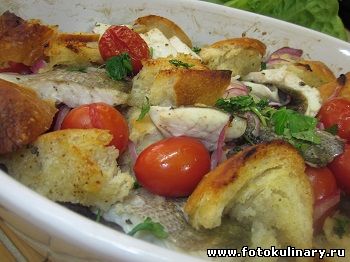 Есть такие блюда, которые при всей их внешней нарочитой домашности и небрежности так и хочется подать именно гостям. И дело тут не только в исключительном вкусе этого блюда, и даже не в том, что делать его проще, чем вкусно налить растворимый кофе. Есть у меня подозрение, что ключевое слово здесь "нарочитой". Именная она нарочитая и показная небрежность делает презентацию этого блюда крайне аппетитной и желанной. Вот это блюдо точно из этой серии. Как только видишь поджаристые сверху и пропитанные соками внизу кусочки хлеба... ароматную сочную рыбу... чуть припеченные овощи... честное слово, от желания начинает сводить челюсть. Я Вам предлагаю сегодня если уж не праздничный ужин, то уж семейный то просто на БИС!