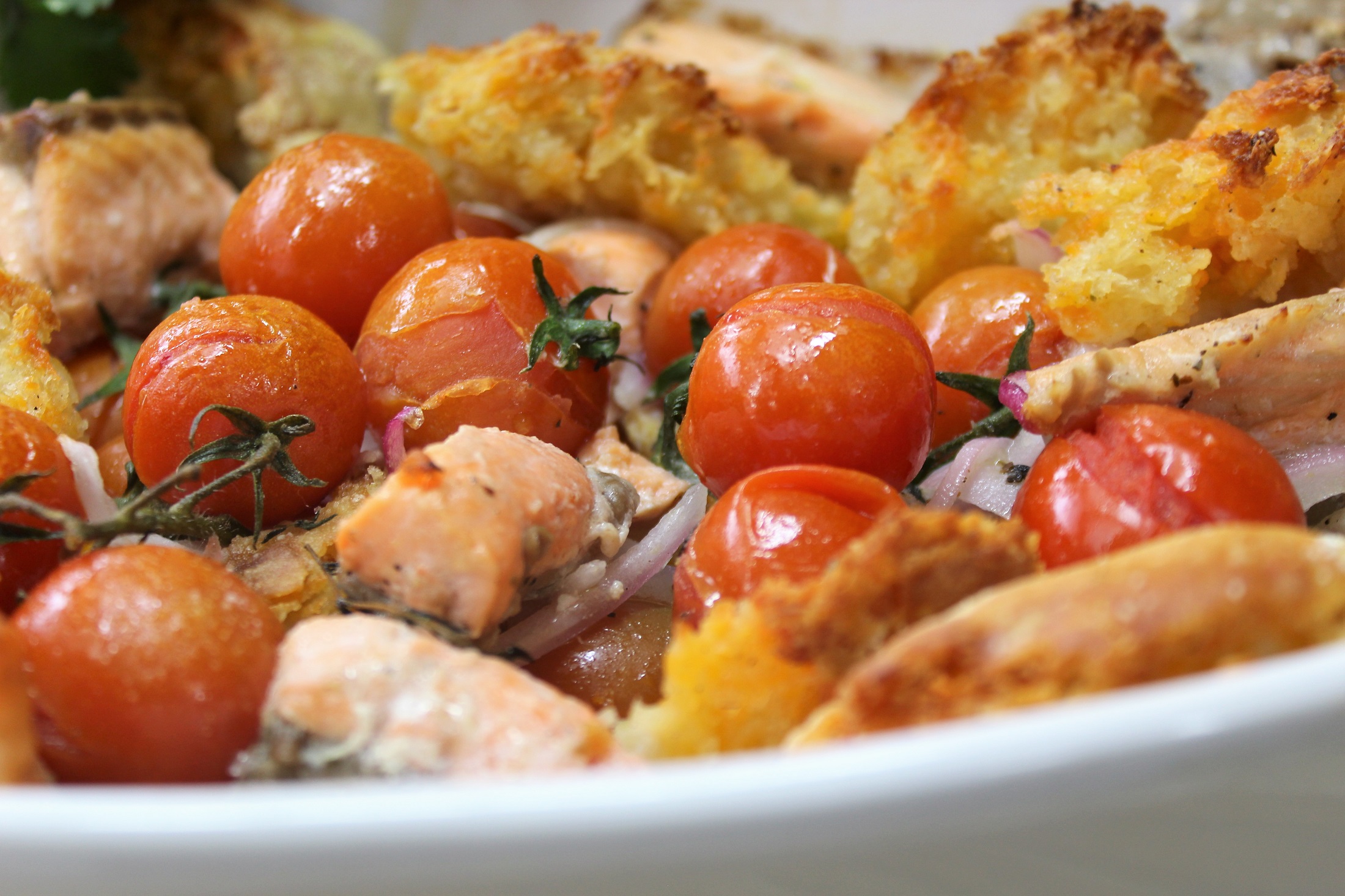 Помидоры достаточно просто помыть. Их и обрывать с ветки можно не напрягаться. Если сами отпадут... туда им и дорога, а нет - так даже еще красивее и ароматнее получится. Хлеб можно аккуратно порезать кусочками ну два на два приблизительно, но лучше не парится... Прямо руками, смачно порвите на абы какие кусочки. Теперь в жаропрочной форме все это смешайте, вместе с приправами и травами, добавьте замаринованную в лимоне рыбу, оливковое масло тоже сюда. Руками, вкусно перемешиваем и в духовку. На 200 градусов минут на 20.
