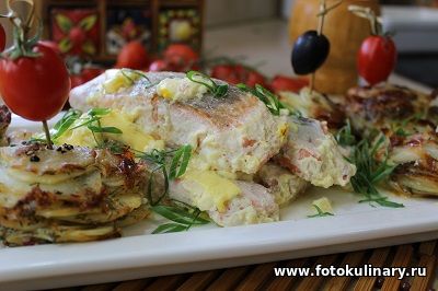 Аккуратно, помогая вилочкой достаем картофельные пирамидки из формы, можно для устойчивости, да и чисто для эстетики, закрепить шпажкой и подаем вместе с ароматной, сочной рыбой. Хотите с нежным, восхитительно желтого цвета, очень мягким по вкусу соусом, хотите без. В любом случае рыбка очень вкусная, а главное, исключительно сочная. Как и обещали: все готово одновременно, было реально не сложно, а получилось очень вкусно... да и красиво! Угощайтесь! Приятного Вам аппетита!