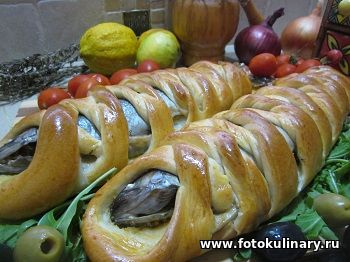 и заплетаем их вокруг рыбки, чуть подкручивая, чтобы сама рыбка была видна через тесто и имела возможность во время выпечки тоже немного подзолотиться.