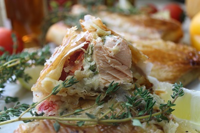 На готовый конвертик пока еще горячий кладем веточку тимьяна или розмарина и ВСЕ! Все готово, чтобы угостить и удивить и насладиться вкусной и простой едой, вполне достойной, чтобы быть поданной и в ресторанчике с бокальчиком белого вина. Ну правда вкусно! Угощайтесь! Приятного Вам аппетита.