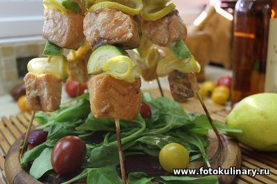 Теперь собираем сам шашлычок поочередно нанизая на него кабачок, сложенный пополам ломтик лимона и рыбу. На каждую шпажку приходится по 3 кусочка рыбы.